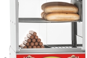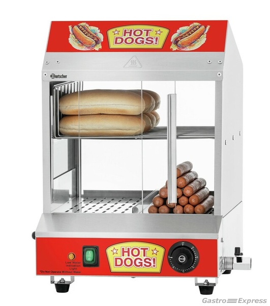 Der Hot Dog Dämpfer erwärmt und hält bis zu 100 Hot Dog Würstchen und bis zu 15 Hot Dog Brötchen warm. Die Glasfront auf der Kundenseite und das ansprechende Design laden Jung und Alt zum typisch amerikanischen Genuss ein.