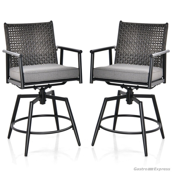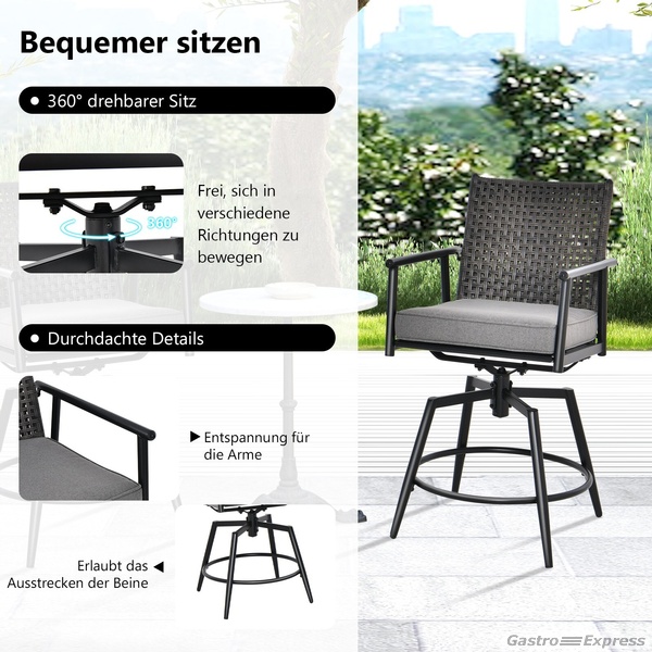 Dank des um 360° drehbaren Sitzes können Sie mühelos in verschiedene Richtungen mit Ihren Freunden sprechen. Jeder Barhocker ist zudem mit 24 cm hohen Armlehnen und einer 19 cm hohen Fußstütze ausgestattet, um Ihnen die bequemste Sitzposition zu ermöglichen.