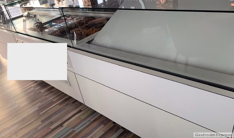 3-teilige Verkaufsvitrine, mit Glas zum hin und her schieben. Zur Zeit nicht an Kühlung angeschlossen. Jedes Element / Teil hat eine grosse Schublade als Stauraum. Masse pro Element ca. 1m x 1.40m, die Glaselemente kann man wegnehmen. Die Elemente sind ziemlich schwer und haben keine Räder.