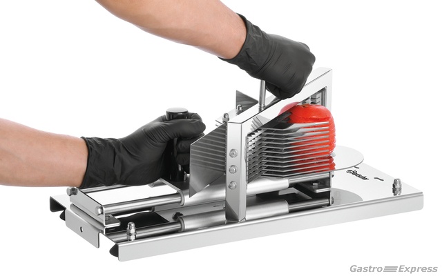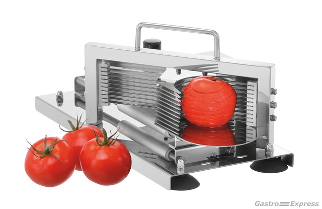 Spielend leicht – Tomatenscheiben für Salate, als Topping für Burger oder fürs Buffet. Der manuelle Tomatenschneider überzeugt durch einfache Handhabung und saubere Schnittergebnisse.