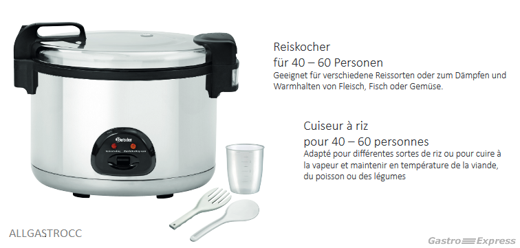 Der Gastro Reiskocher von Bartscher ist günstig und kommt mit Warmhaltefunktion. Der professionelle Reiskocher mit einer kompletten Aussenhaut aus rostfreiem Stahl ist bei der breiten Kundschaft äusserst beliebt. Der Innentopf ist so beschichtet, dass kein ankleben von Reis vorkommen kann.