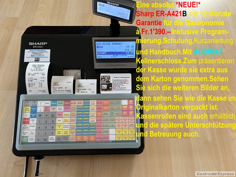 Eine *NEUE* Registrierkasse Sharp ER-A421B Anthrazit/schwarz. Exklusiv für die Gastronomie. Da die Kasse mit einem Addimatmagnetcodeschloss und Stifte ausgerüstet ist. Insbesondere können auch Bestellbon?s für die Küche oder Theke programmiert werden. Mit oder ohne SCHUBLADE. Der Käufer kann wählen. Die Kasse kann von mir als Verkäufer, für den Käufer zu seinen Bedürfnissen programmiert, instruiert und später auch betreut werden. Der Preis CHF 1'390.-- versteht sich inkl. Programmierung, Schulung und Bedienungsanleitungen.