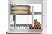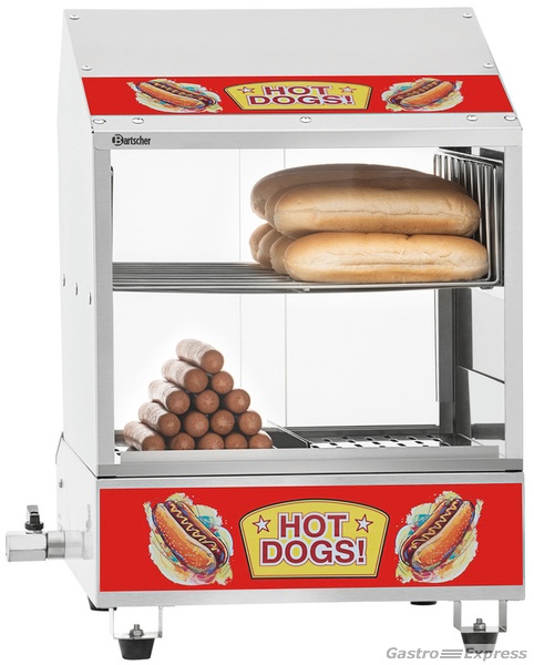 Der Hot Dog Dämpfer erwärmt und hält bis zu 100 Hot Dog Würstchen und bis zu 15 Hot Dog Brötchen warm. Die Glasfront auf der Kundenseite und das ansprechende Design laden Jung und Alt zum typisch amerikanischen Genuss ein.
