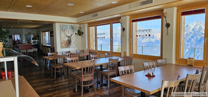 Es verfügt über 14 Zimmer mit DU/WC. Ein helles Restaurant mit Aussicht und Platz für bis zu 80 Personen, des weiteren finden auf der Terrasse rund ums Haus bis 200 Personen Platz. Beim Buffetbereich ist eine kleine Bar.