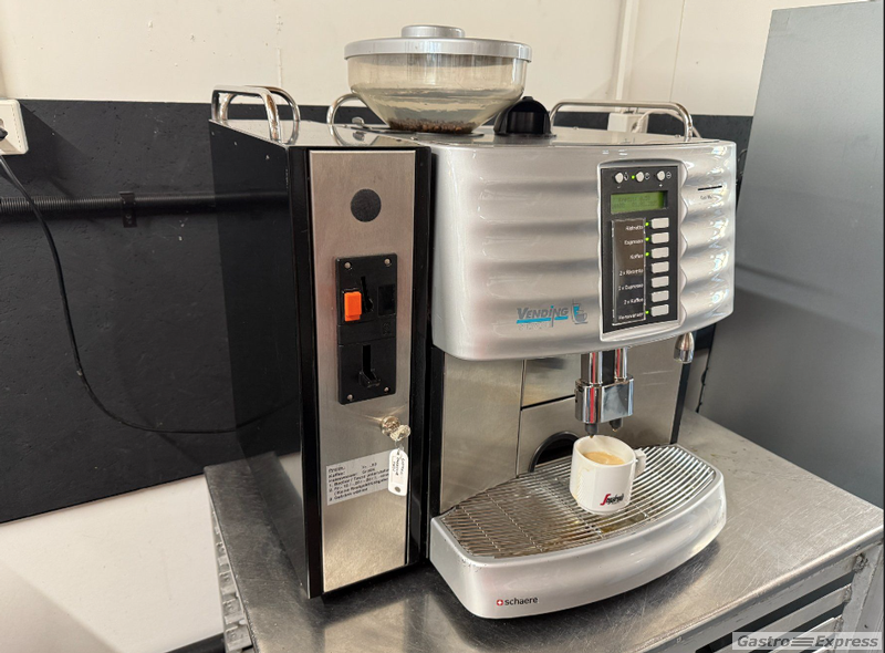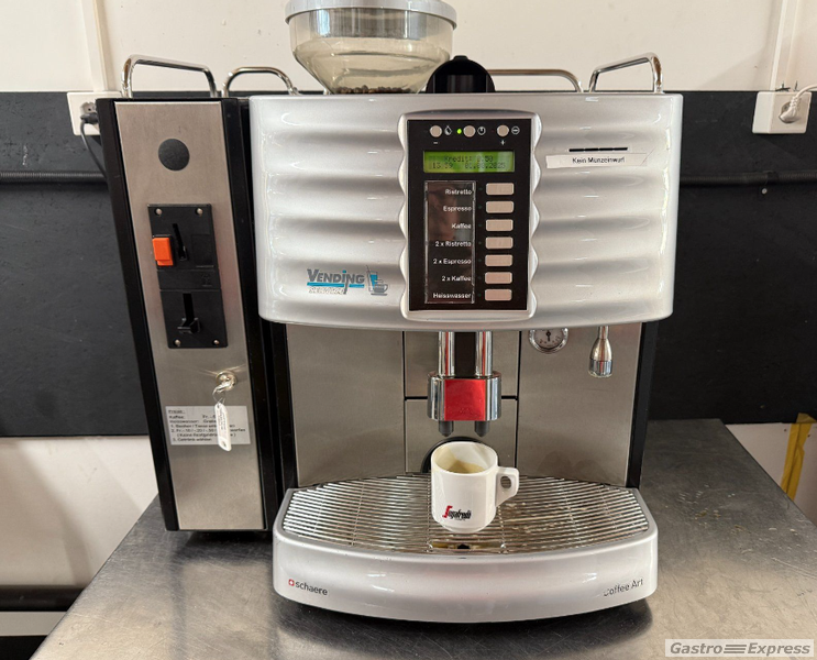 Verkaufe eine gebrauchte Schaerer Profi-Kaffeemaschine in Silber mit Münzprüfer.