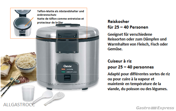 Der Gastro Reiskocher von Bartscher ist günstig und hat eine Warmhaltefunktion. Der professionelle Reiskocher mit einer kompletten Aussenhaut aus rostfreiem Stahl ist bei der breiten Kundschaft äusserst beliebt. Der Innentopf ist so beschichtet, dass kein ankleben von Reis vorkommen kann. Das Gerät zu reinigen ist dank des herausnehmbaren Innentopfs kein Problem.