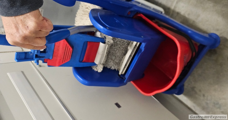 Mit 2 Eimern und Presse um den Boden Wischmop auszupressen.