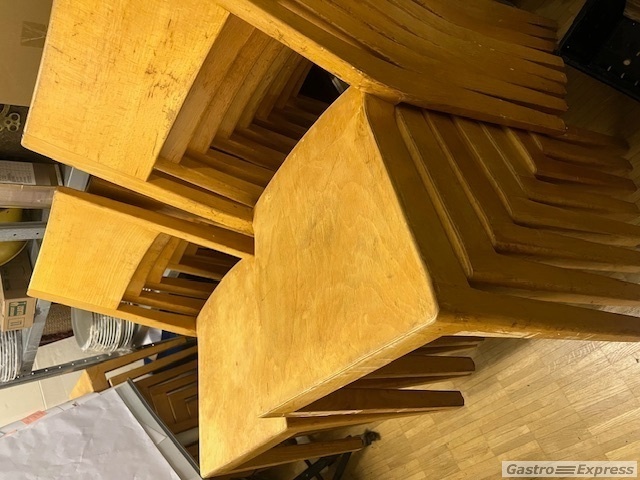 Zu verkaufen ist ein Set von 24 originalen Horgenglarus-Stapelstühlen aus Massivholz.