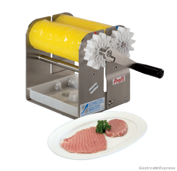 Entdecken Sie die Vorzüge des SCHNITZELMASTER, einem Arbeitsgerät von außergewöhnlicher Qualität und Langlebigkeit, das die Verarbeitung jedes knochenlosen Fleischstücks ermöglicht. Der SCHNITZELMASTER ist keine herkömmliche Steakeinrichtung, die die Zellstruktur des Fleisches beeinträchtigt. Vielmehr bewahrt er den Saft im Fleisch, was zu einem reduzierten Gewichtsverlust führt. Dank seiner speziellen Mürbewalzen wird eine effektive Flächenvergrößerung des Fleisches erreicht. Der einstellbare Walzenabstand garantiert eine gleichmäßige Fleischdicke von bis zu 12 mm, und mit einer Zusatzwalze sogar bis zu 30 mm für Steaks und Rinderfilets.