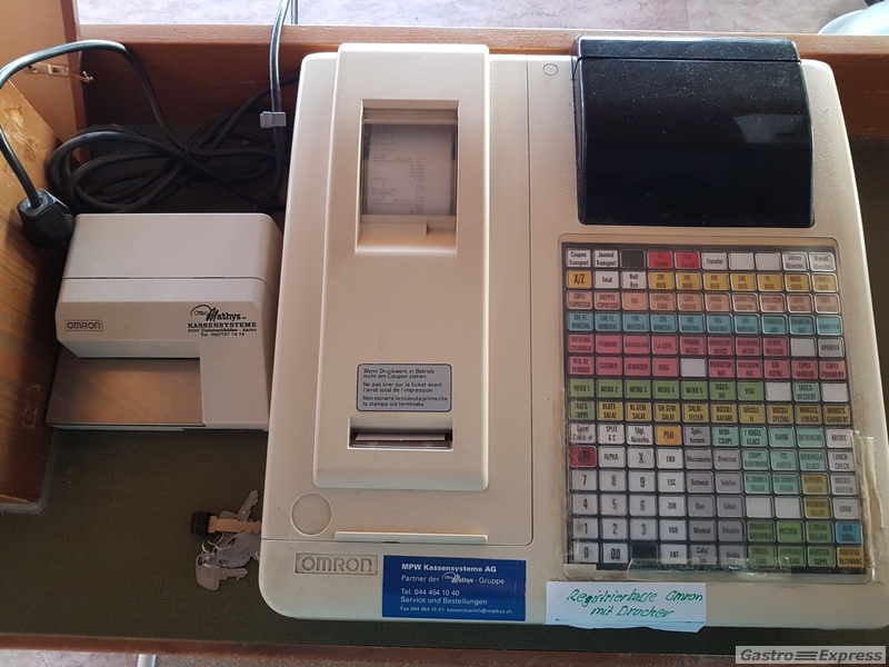 Registrierkasse Omron RS 3440 mit Beistelldrucker für Rechnungsformulare.