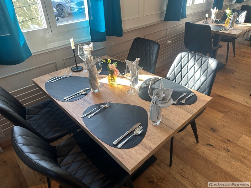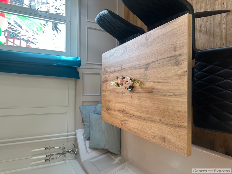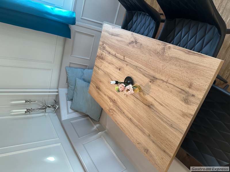 Zu verkaufen: hochwertiger Gastronomietisch mit robuster MDF-Tischplatte in Eiche-Optik. Ideal für Restaurants, Cafés, Bars oder Kantinen.