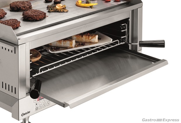 Die platzsparende Grill-Salamander-Kombination verfügt über eine leistungsstarke Griddleplatte mit 2 getrennt schaltbaren Heizzonen. Die Wärmezufuhr des Salamanders lässt sich perfekt mit dem höhenverstellbaren Rost und der stufenlos einstellbaren Temperatur regulieren. Mit dem digitalen Timer sind Grill- und Gratiniervorgänge bestens unter Kontrolle – auch in Stosszeiten.