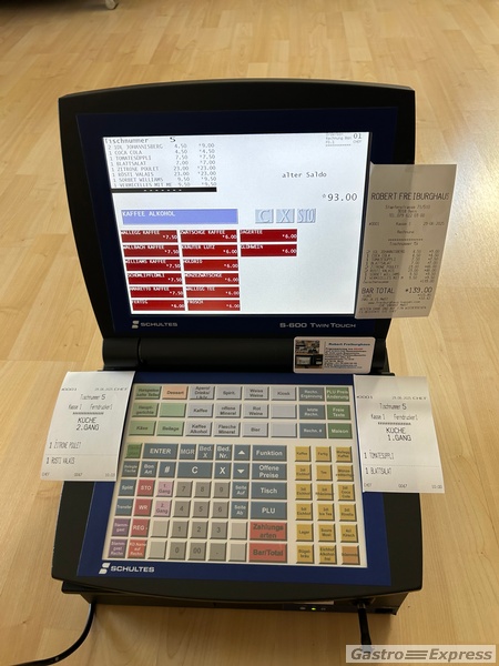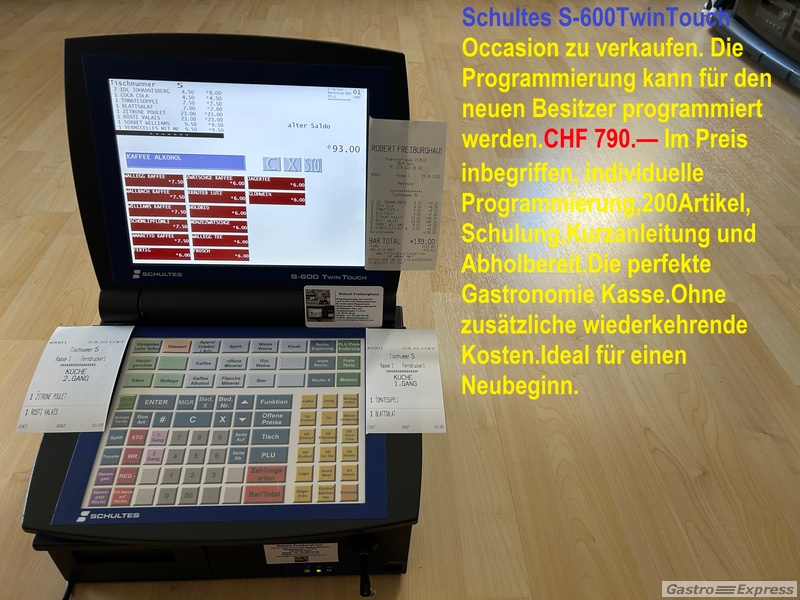 Schultes S-600TwinTouch mit Addimatkellnerstifte REVIDIERT! NEUER AKKUPACK zu verkaufen. Gerät in TOP Zustand. Wurde von mir als Verkäufer immer gepflegt. Preis CHF 790.-- Inklusive Programmierung 200 PLU. Jedes weitere PLU CHF 1.00 pro PLU. Die Schulung ist auch in diesem Verkaufspreis inbegriffen. Passende Rollen können auch erworben werden. Thermopapierrollen Bisphenolfrei 80mm x 70mmØ 70gm² CHF 1.90 pro Rolle. Nebst diesem Angebot, verkaufe oder programmiere ich allerlei SHARP Registrierkassenmodelle, z.B. XE-A Modelle 113,137,147,201,202,212,203,213,207,217,307.ER-A Modelle 410,420,411 und 421. Manchmal braucht es nur ein gewisses Fachwissen um solche Modelle wieder in Betrieb und auf Vordermann bringen zu können. Selbstverständlich habe ich auch Occasion Kassen im Angebot von diesen voraus erwähnten Kassenmodelle und ebenfalls passende Thermopapierrollen.