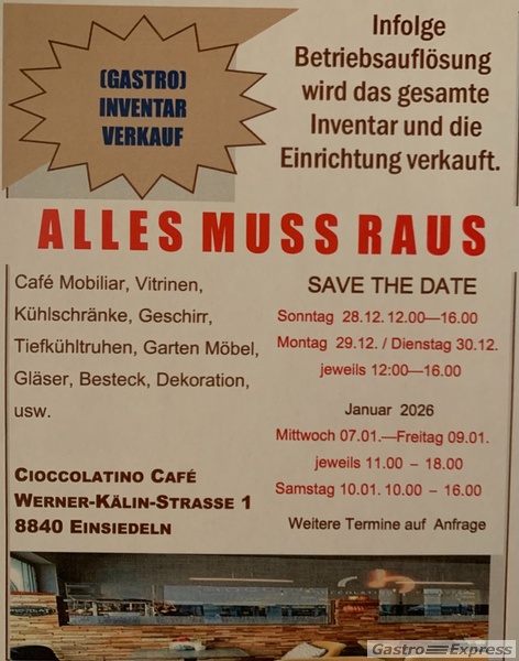 Tische, Sessel, Gläser, Besteck, Teller, Maschinen, Geräte, Küchenzeile, Marmorplatte (als Tisch), Vitrinen, Glace-Vitrine, Kasse Casio, usw.