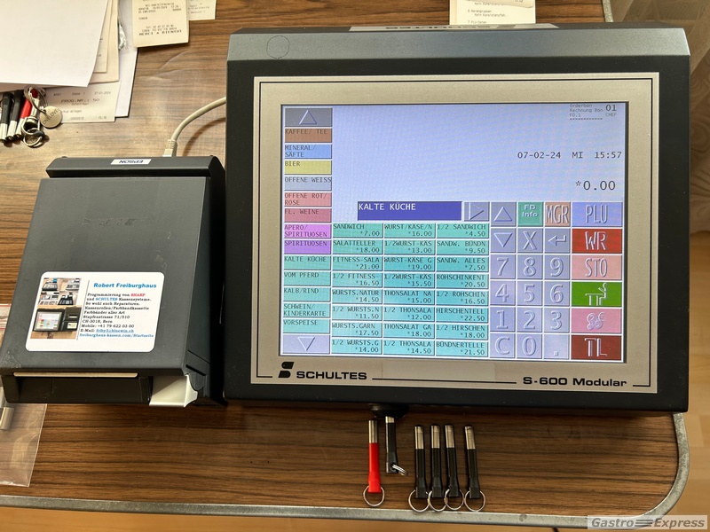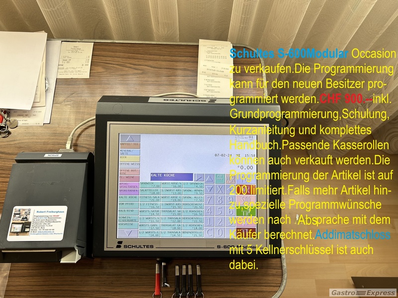 Schultes S-600Modular mit Epson Rechnungsdrucker TM-T70, zu verkaufen. Geräte in TOP Zustand. Wurde von mir als Techniker und Verkäufer immer gepflegt. Preis CHF 900.-- Inklusive 200 PLU programmiert.Jedes weitere PLU CHF 1.00 pro PLU. Die Schulung ist auch in diesem Verkaufspreis inbegriffen. Passende Rollen können auch erworben werden. Thermopapierrollen Bisphenolfrei 80mm x 70mmØ 70gm² CHF 1.90 pro Rolle. Nebst diesem Angebot, verkaufe oder programmiere ich allerlei SHARP Registrierkassenmodelle, z.B. XE-A Modelle 113,137,147,201,202,212,203,213,207,217,307.ER-A Modelle 410,420,411 und 421. Manchmal braucht es nur ein gewisses Fachwissen um solche Modelle wieder in Betrieb und auf Vordermann bringen zu können. Selbstverständlich habe ich auch Occasion Kassen im Angebot von diesen voraus erwähnten Kassenmodelle und ebenfalls passende Thermopapierrollen.