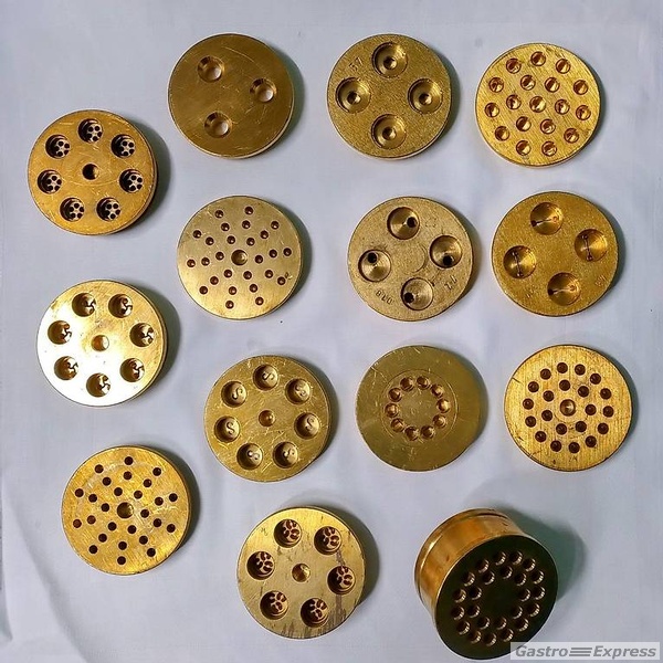 Die Maschine hat einen automatischen Teigschneider, 14 Bronze-Matritzen für die unterschiedlichsten Nudelformen und eine Stundenleistung von 25kg Teig laut Hersteller.