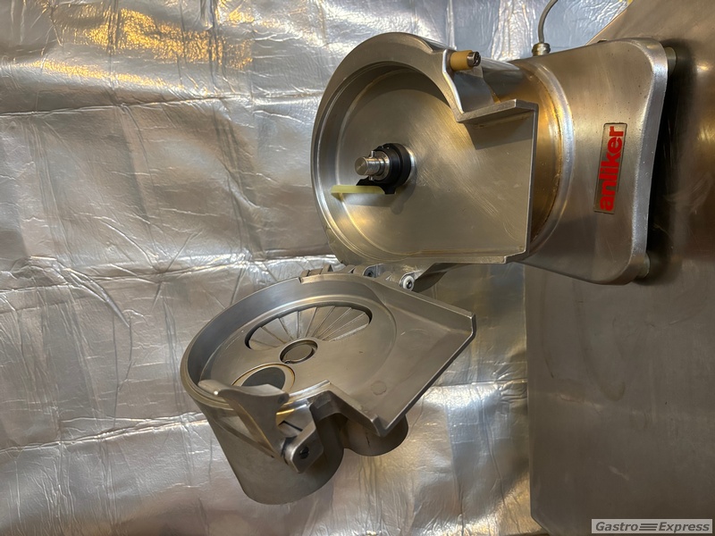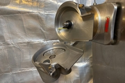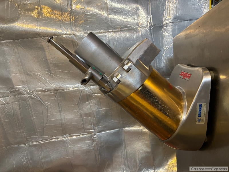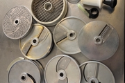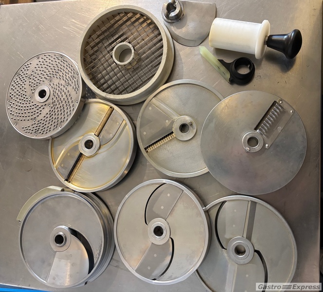 Gemüseschneidemaschine von Brunner-Anliker mit den 8 abgebildeten Scheiben, Auswerfer, Drehstössel sowie Verschlussrolle.